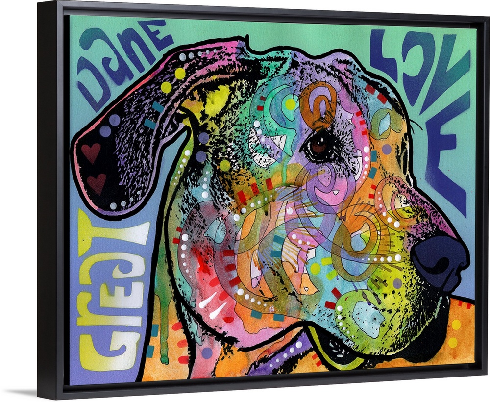 <p>"Great Dane Love" written around a colorful painting of a Great Dane with abstract markings.</p>