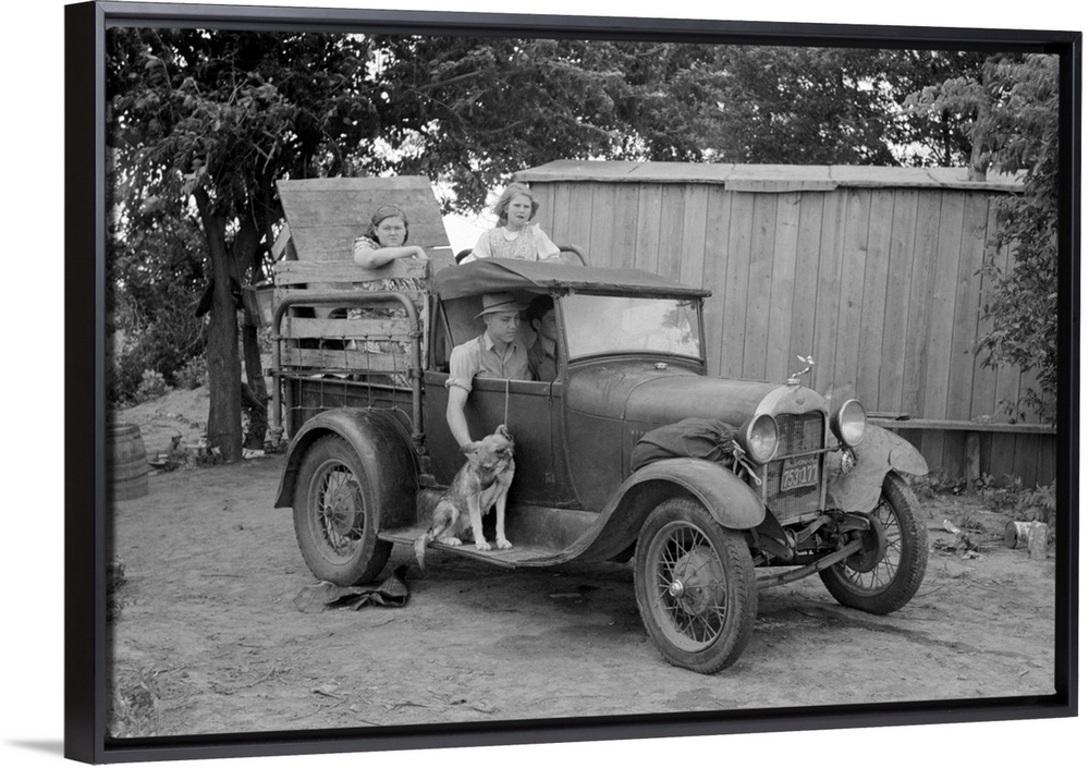 <p>Great Depression era photograph of a migrant family in a packed car preparing to leave.</p>