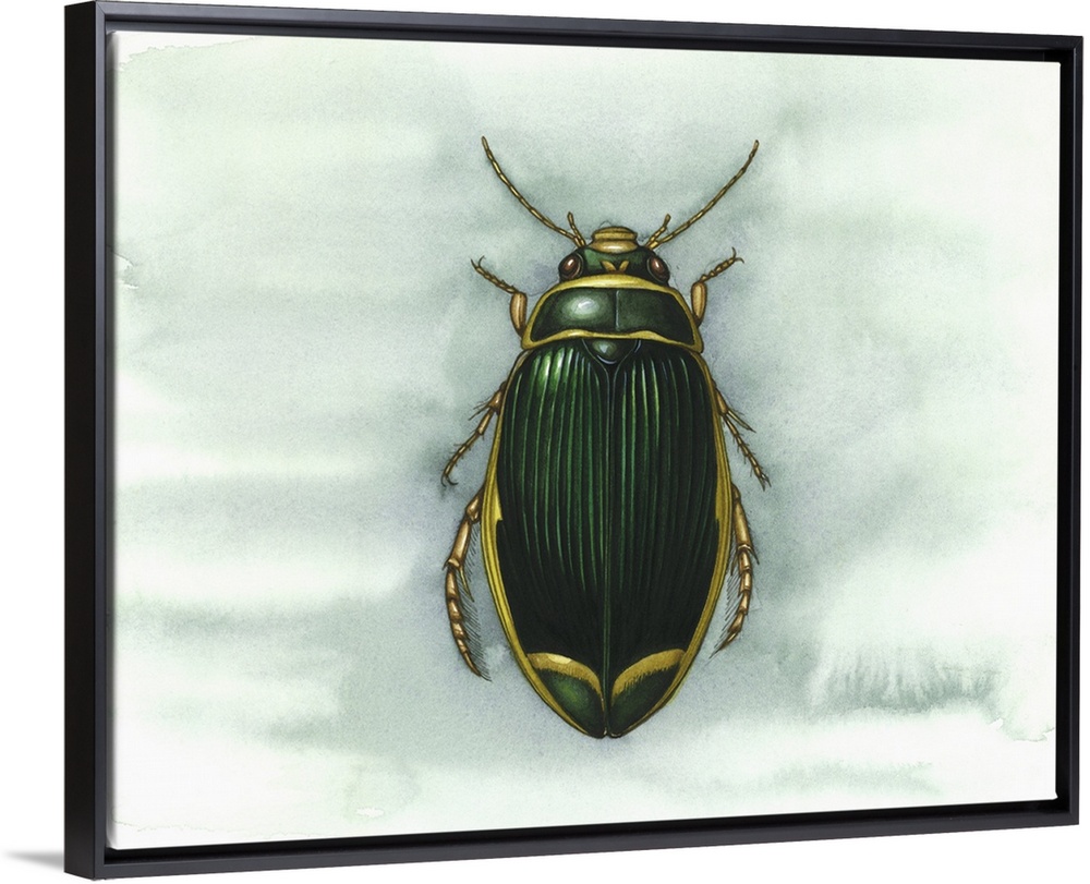 <p>Great diving beetle (Dytiscus marginalis), artwork. This aquatic freshwater beetle is found in Europe and northern Asia. It can grow up to 35 millimetres in length. It is predatory and will feed on other insects, tadpoles and small fish. As its name suggests, it will dive to hunt its prey.</p>