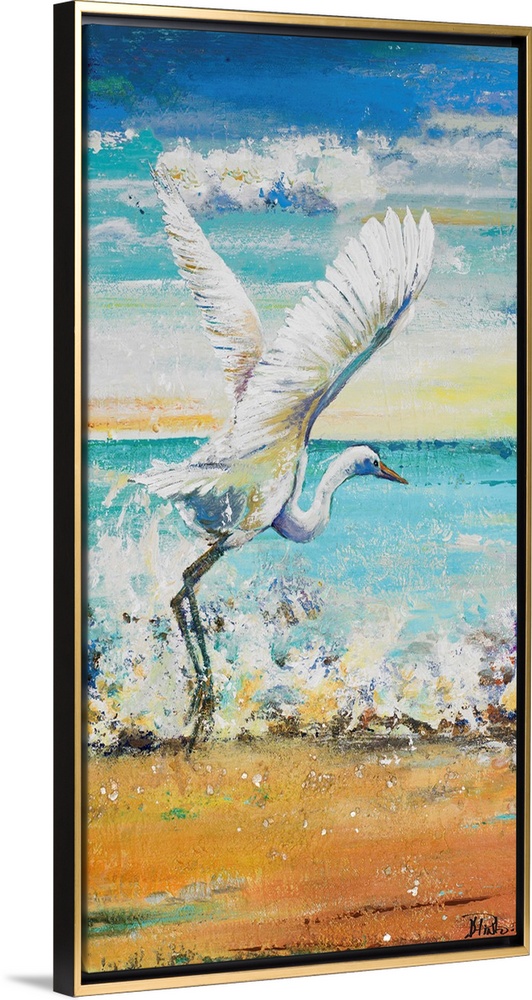 <p>Contemporary painting of a white egret taking to flight on a beach.</p>