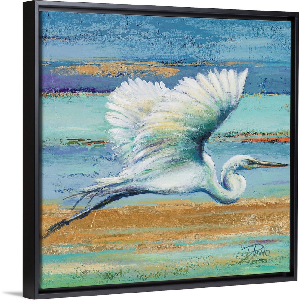 <p>Contemporary painting of a white egret in flight against a blue and green abstract background.</p>