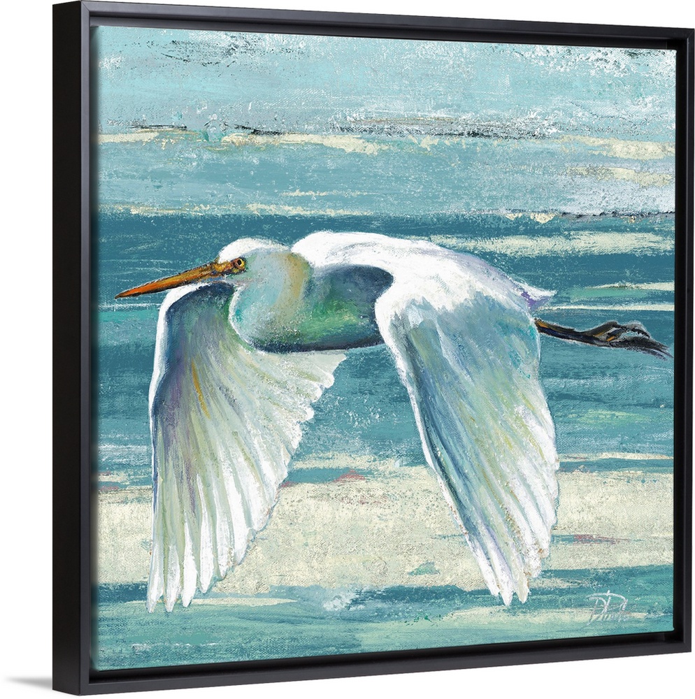 <p>Contemporary painting of a white egret in flight against a blue abstract background.</p>