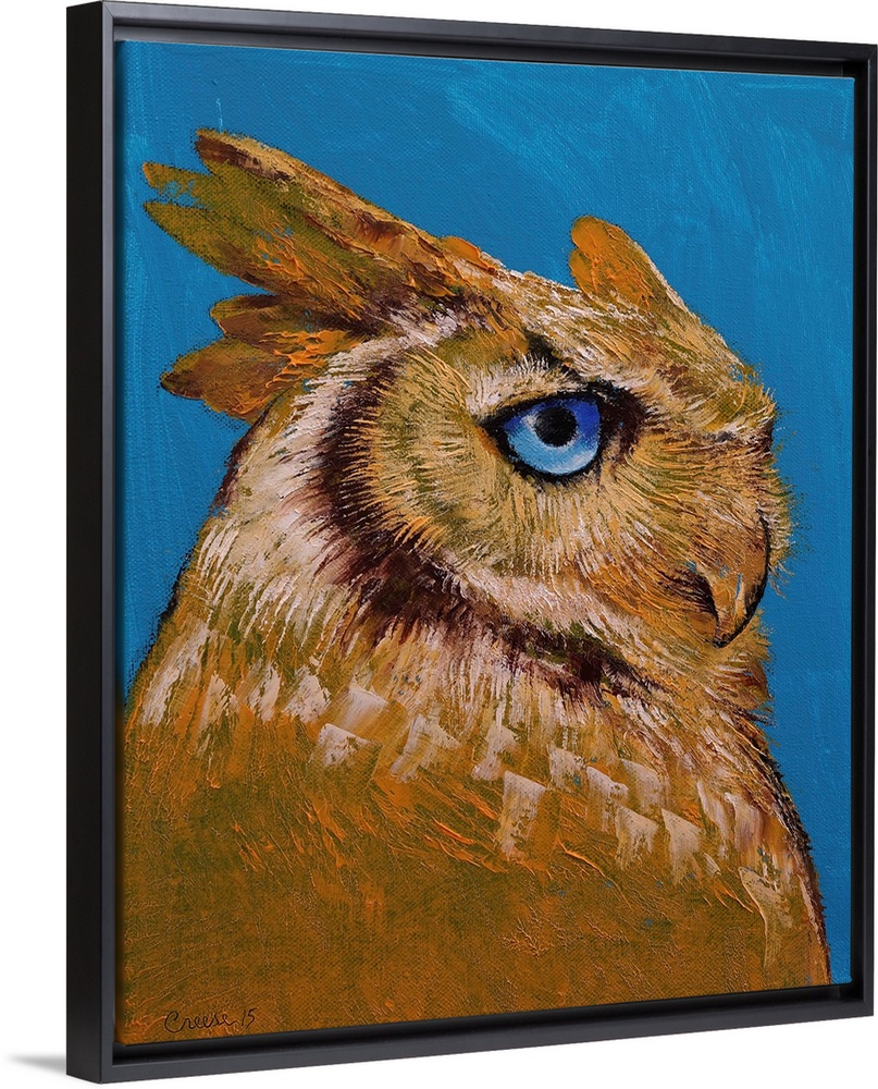 <p>A contemporary painting of a brown owl with piercing blue eyes.</p>