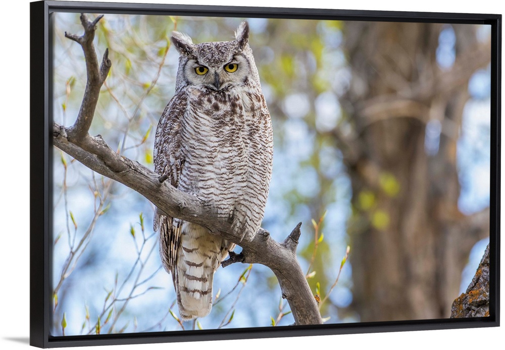 <p>USA, Wyoming, Lincoln County, a Great Horned Owl perches on a limb of a cottonwod tree.</p>
