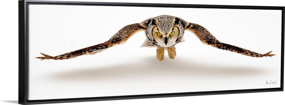 <p>Adult Great Horned Owl (Bubo virginianus) in flight with shadow on snow, Southern Manitoba, Canada.</p>