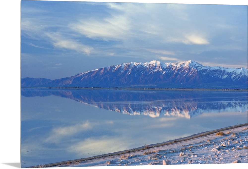 <p>View from Antelope Island Causeway at sunset of Great Salt Lake and Northern Wasatch Mountains including Willard Peak and Ben Lomond Peak, Antelope Island State Park near Salt Lake City, Utah.</p>