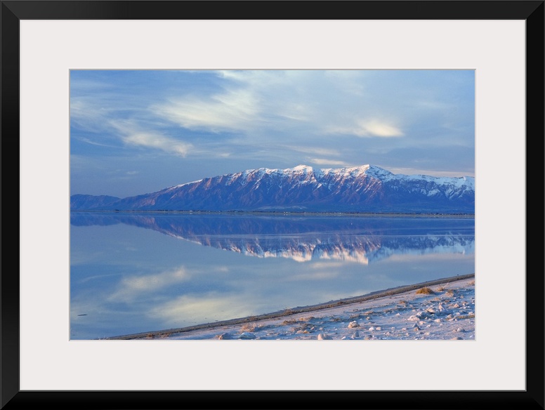<p>View from Antelope Island Causeway at sunset of Great Salt Lake and Northern Wasatch Mountains including Willard Peak and Ben Lomond Peak, Antelope Island State Park near Salt Lake City, Utah.</p>