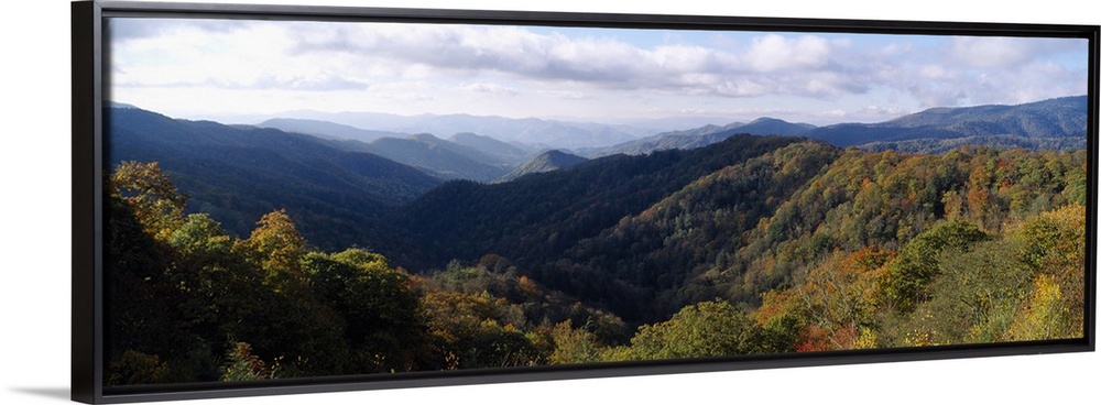 <p>Panoramic, high angle photograph of tree tops covering the Great Smoky Mountains National Park in Tennessee.</p>