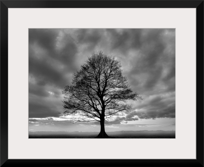 <p>A horizontal black and white photograph of a single tree in a field covered in mist with dramatic clouds in the sky.</p>