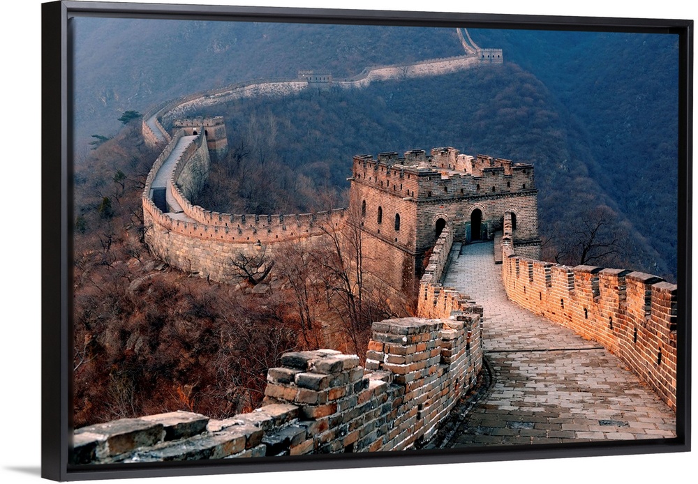 <p>Great Wall of China at sunset in a rolling mountainous valley.</p>