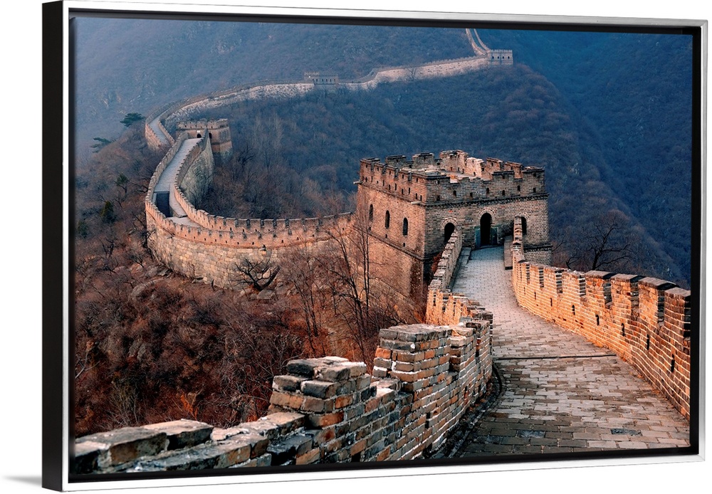 <p>Great Wall of China at sunset in a rolling mountainous valley.</p>