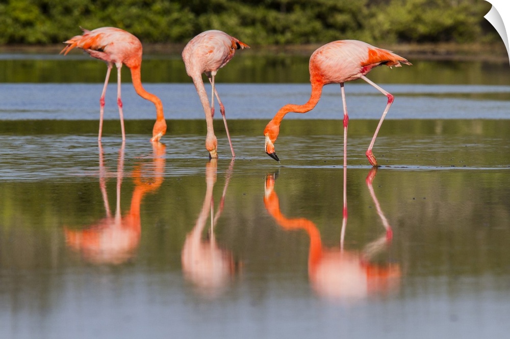 <p>Greater flamingos (Phoenicopterus ruber) foraging for small pink shrimp in saltwater lagoon in the Galapagos Islands, UNESCO World Heritage Site, Ecuador, South America</p>
