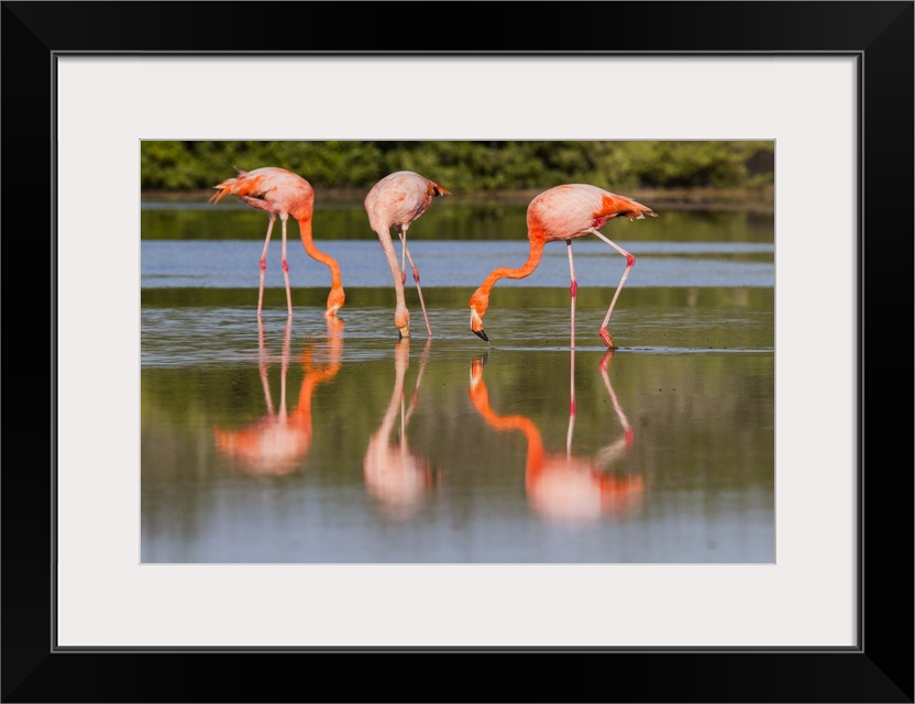 <p>Greater flamingos (Phoenicopterus ruber) foraging for small pink shrimp in saltwater lagoon in the Galapagos Islands, UNESCO World Heritage Site, Ecuador, South America</p>