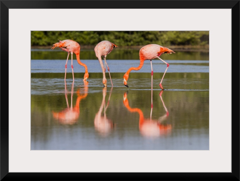 <p>Greater flamingos (Phoenicopterus ruber) foraging for small pink shrimp in saltwater lagoon in the Galapagos Islands, UNESCO World Heritage Site, Ecuador, South America</p>