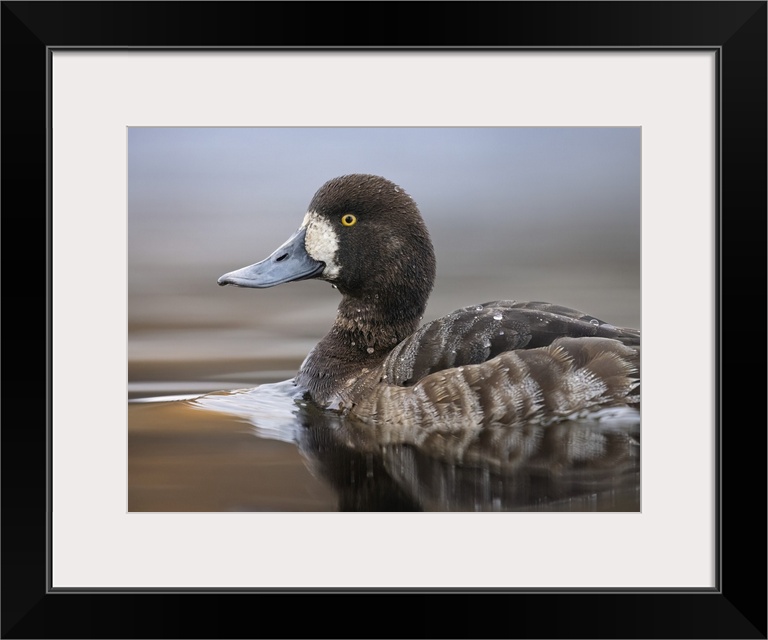 <p>Greater scaup hen (Aythya marila) cruises a lakeshore in South-central Alaska in April; Anchorage, Alaska, United States of America.</p>