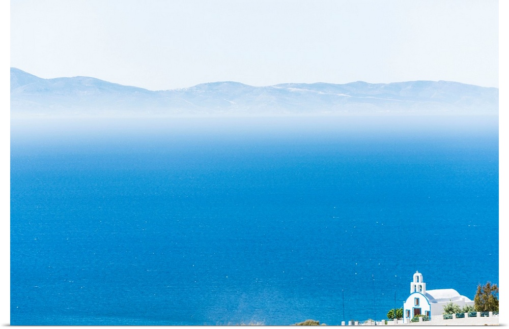 <p>Greece, Cyclades, Santorini island, A typical Greek orthodox church on the Cyclades island Santorini with the Mediterranean and a neighborhood island in the background.</p>
