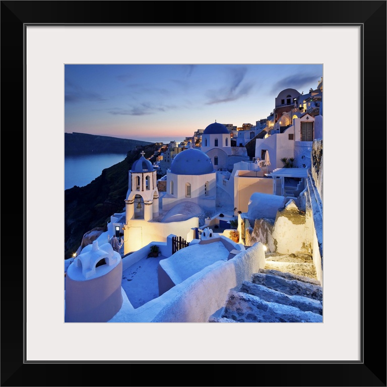 <p>Greece, Aegean islands, Cyclades, Santorini island, Greek Islands, Typical church in Oia village at dusk.</p>