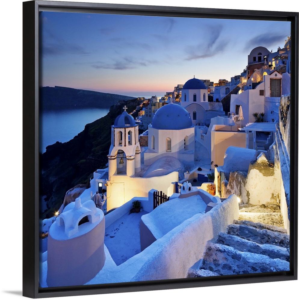 <p>Greece, Aegean islands, Cyclades, Santorini island, Greek Islands, Typical church in Oia village at dusk.</p>