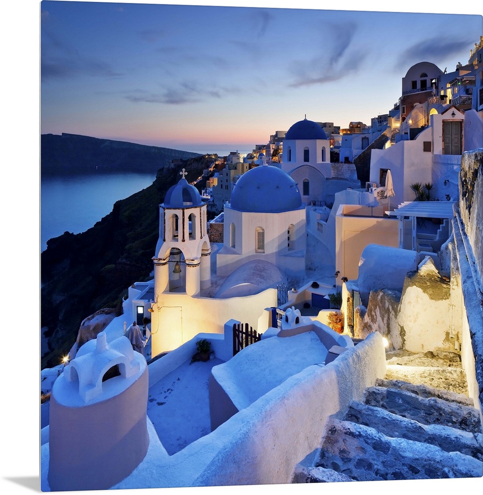 <p>Greece, Aegean islands, Cyclades, Santorini island, Greek Islands, Typical church in Oia village at dusk.</p>