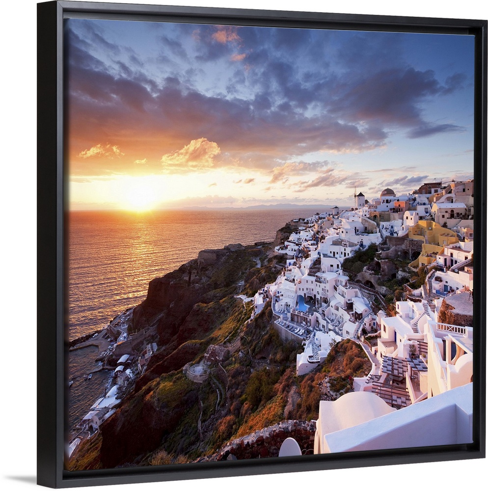 <p>Greece, Aegean islands, Cyclades, Santorini island, Greek Islands, Oia village at sunset.</p>