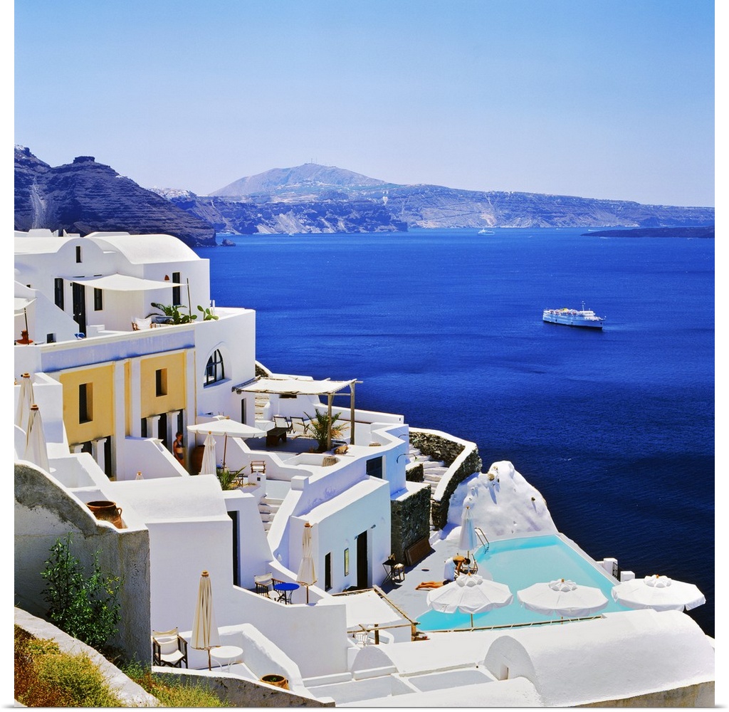 <p>Greece, Aegean islands, Cyclades, Santorini island, Thera, Mediterranean area, Mediterranean sea, Travel Destination, Oia, view towards the crater</p>