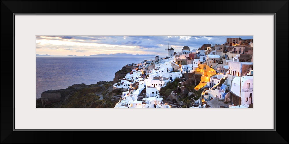 <p>Greece, Aegean islands, Cyclades, Santorini island, Greek Islands, Oia village illuminated at dusk.</p>