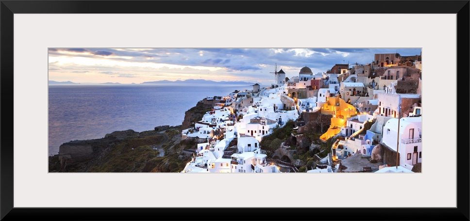 <p>Greece, Aegean islands, Cyclades, Santorini island, Greek Islands, Oia village illuminated at dusk.</p>
