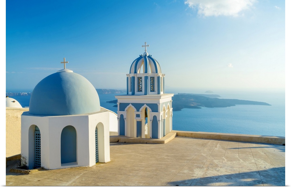 <p>Greece, Aegean islands, Cyclades, Santorini island, Thera, Mediterranean sea, Aegean sea, Greek Islands, Typical church in Fira</p>