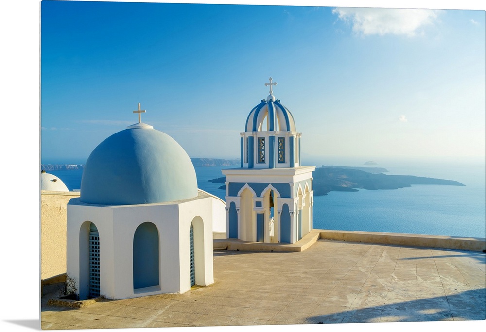 <p>Greece, Aegean islands, Cyclades, Santorini island, Thera, Mediterranean sea, Aegean sea, Greek Islands, Typical church in Fira</p>