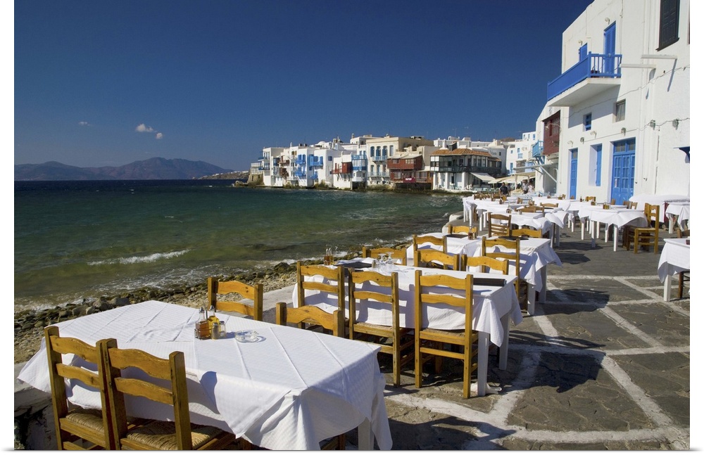 <p>Greece and Greek Island of Mykonos and the harbor town of Hora along the shoreline of little Venice, and there restaurants</p>
