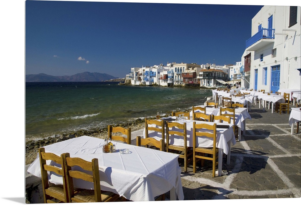 <p>Greece and Greek Island of Mykonos and the harbor town of Hora along the shoreline of little Venice, and there restaurants</p>