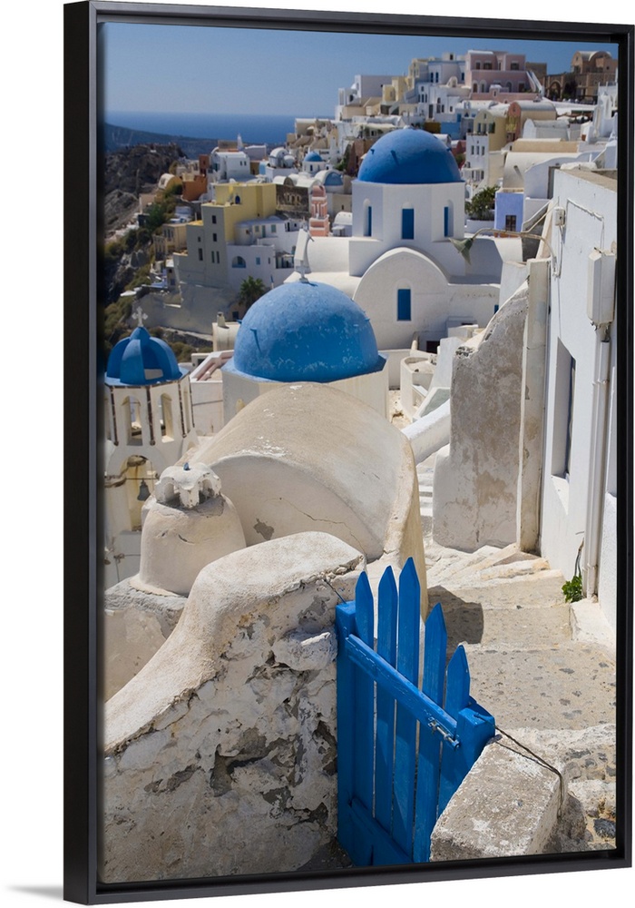 <p>Greece and Greek Island of Santorini town of Oia with Blue Domed Churches with white and colorful buidling surrounding them</p>