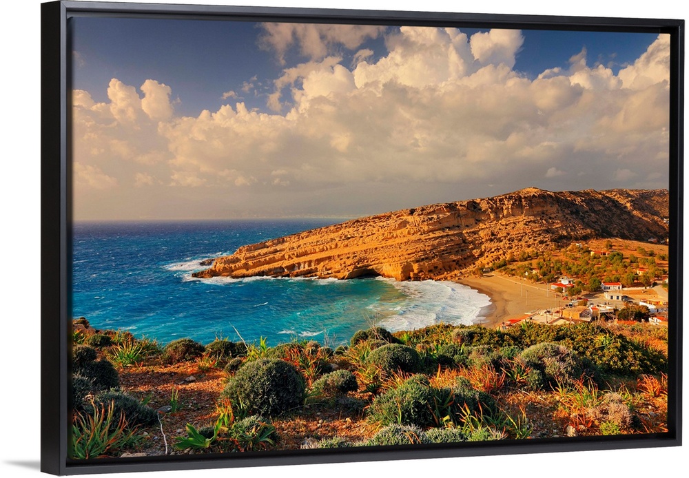 <p>Greece, Crete Island, Iraklion, Matala, Mediterranean sea, Aegean sea, Greek Islands, Golden sandy beach and village, with its cliff in the background.</p>