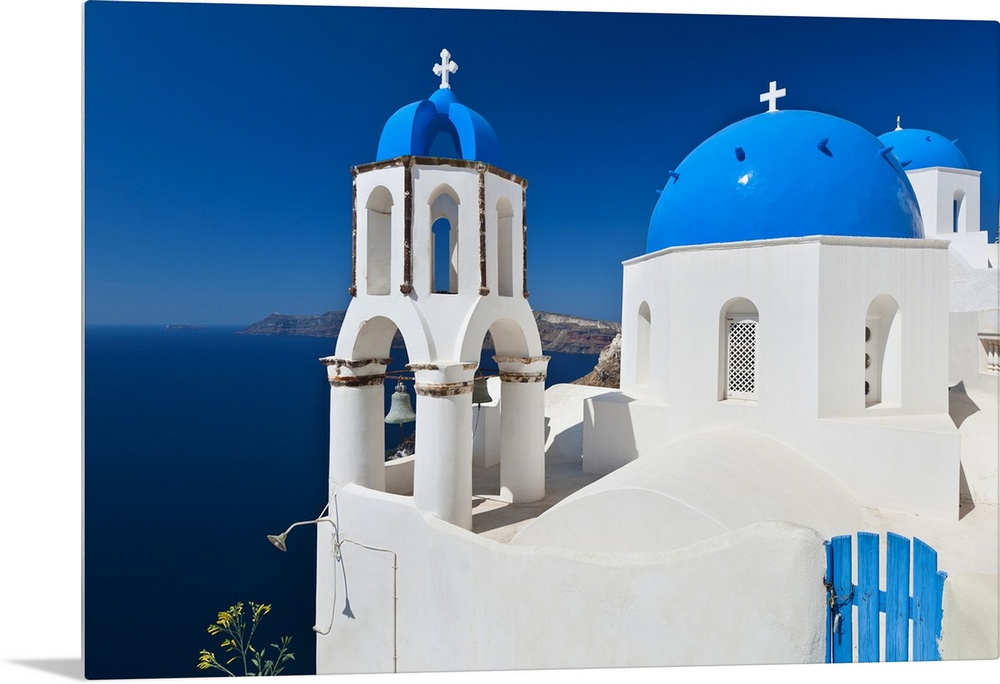 <p>Greece, Cyclades Islands, Santorini, Oia, Church with bell tower at coast</p>