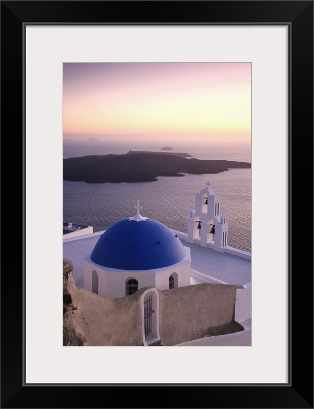 <p>Greece, Cyclades, Santorini, Firostefani, Church and view of Santorini Caldera</p>
