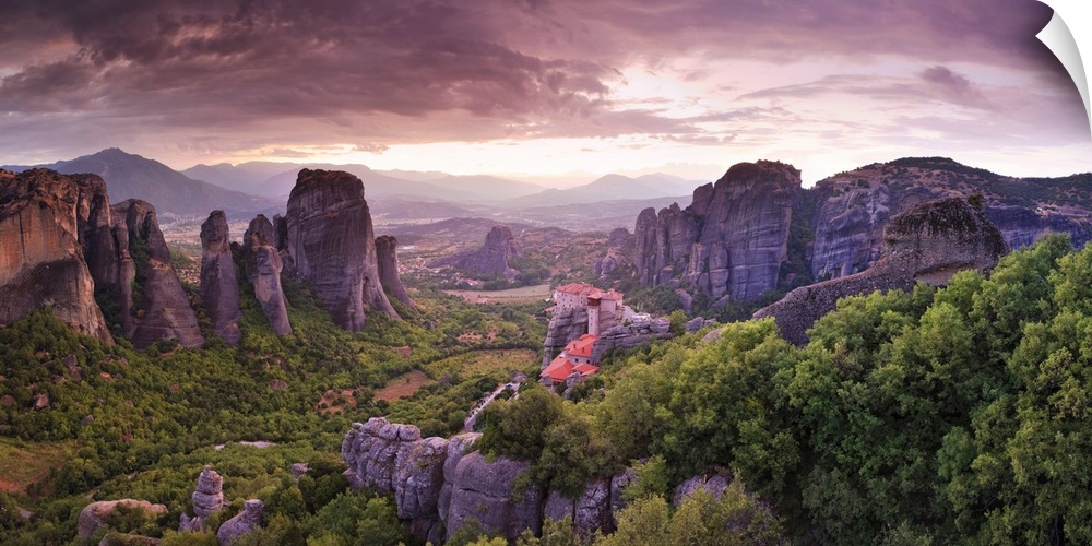 <p>Greece, Thessaly, Meteora, Panoramic view of Meteora and Holy Monastery of Rousanou</p>