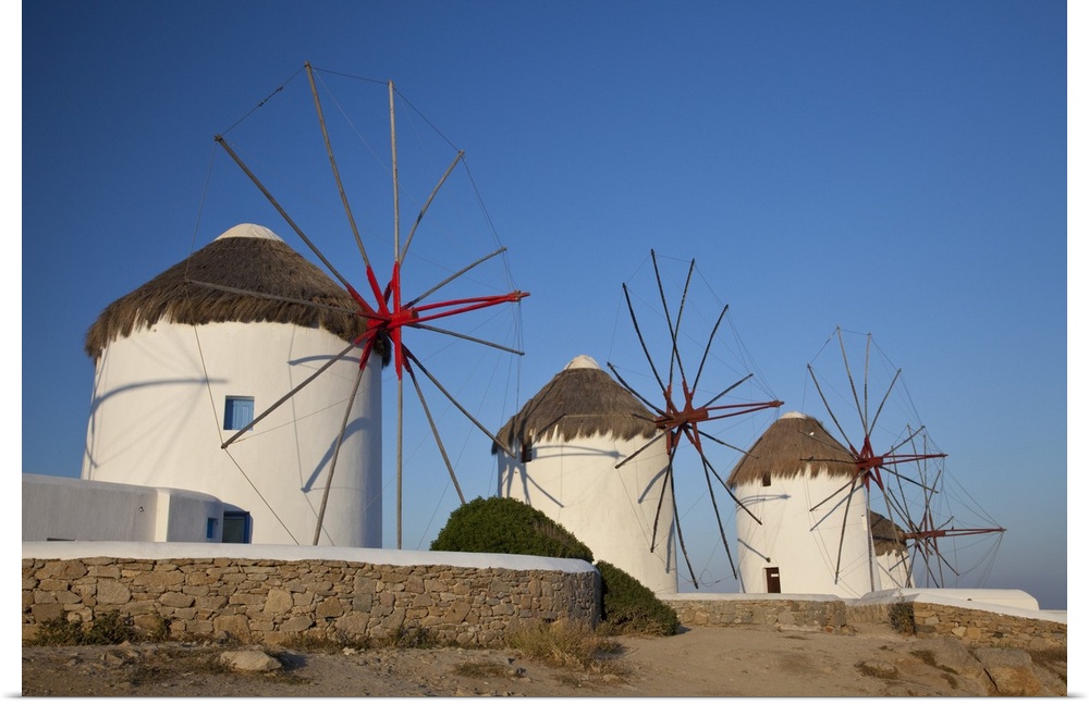 <p>Greece, Mykonos, Windmills Along the Water.</p>