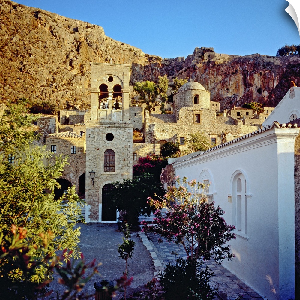 <p>Greece, Peloponnese, Monemvasia, Mediterranean area, Travel Destination, Platia Dsami square and Christo Elkomenos church and bell-tower, Panaghia Myrtidiotissa church towards the rock and the castle</p>