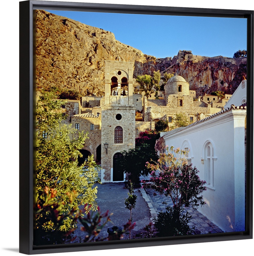 <p>Greece, Peloponnese, Monemvasia, Mediterranean area, Travel Destination, Platia Dsami square and Christo Elkomenos church and bell-tower, Panaghia Myrtidiotissa church towards the rock and the castle</p>