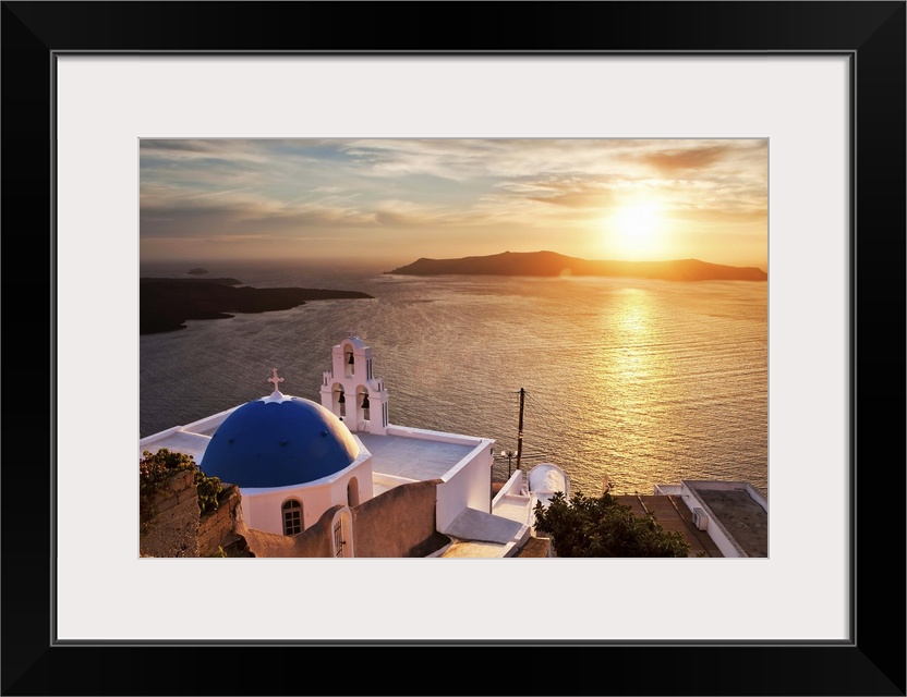 <p>Greece, Aegean islands, Cyclades, Santorini island, Greek Islands, Typical church overlooking the sea and the caldera at sunset, Fira (Thira).</p>