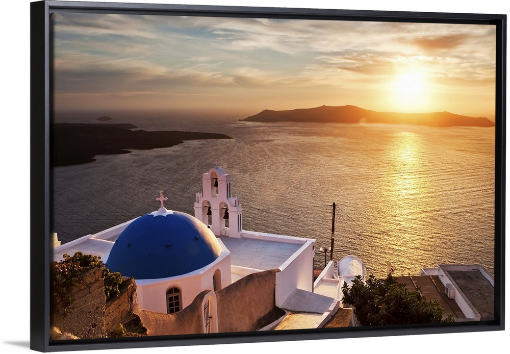 <p>Greece, Aegean islands, Cyclades, Santorini island, Greek Islands, Typical church overlooking the sea and the caldera at sunset, Fira (Thira).</p>