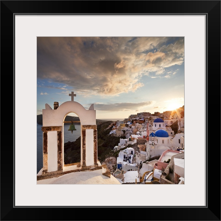 <p>Greece, Aegean islands, Cyclades, Santorini island, Greek Islands, Oia, typical church bell overlooking the village at sunset.</p>