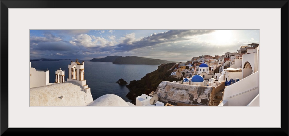 <p>Greece, Aegean islands, Cyclades, Santorini island, Greek Islands, Oia village, typical church bells overlooking the sea.</p>