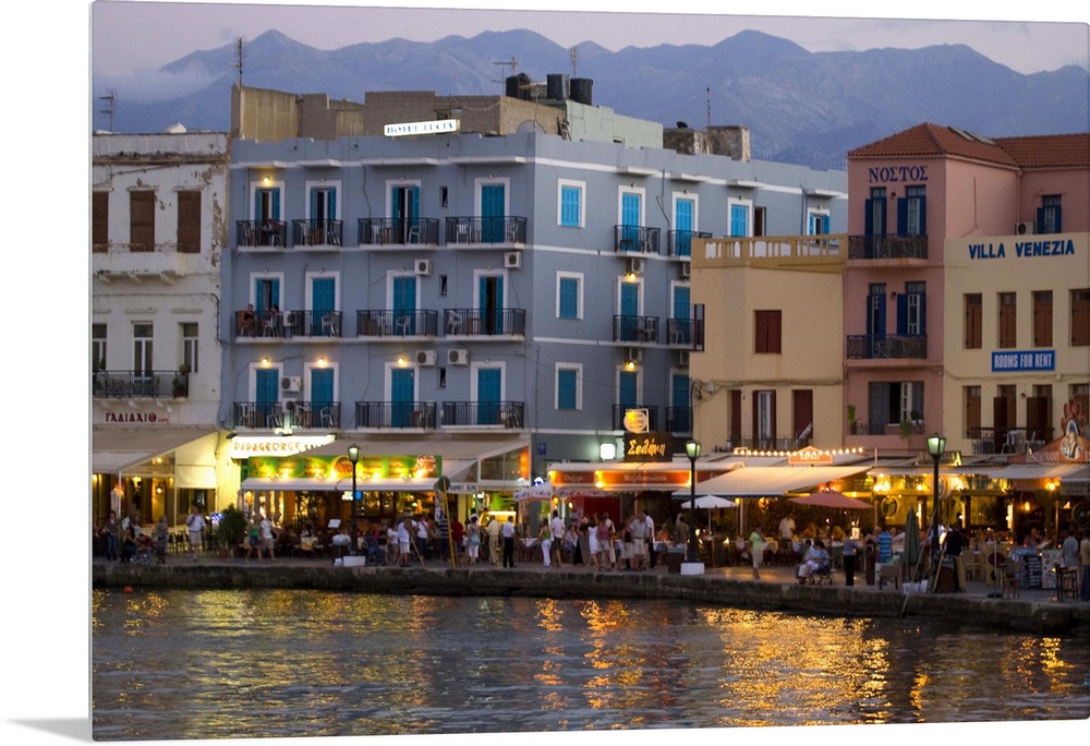 <p>Greek Island of Crete and old town of Chania evening light along the old harbor and the colorful buildings</p>