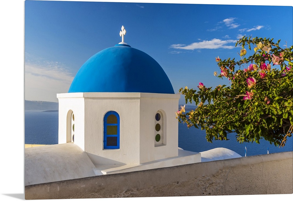 <p>Greek orthodox church with blue dome, Oia, Santorini, South Aegean, Greece</p>