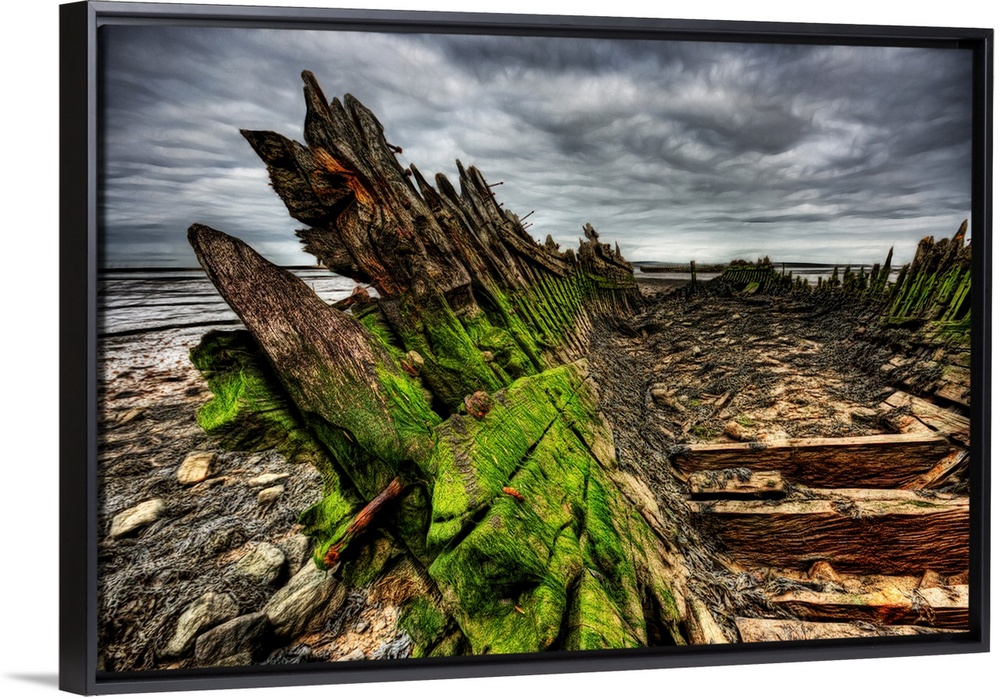<p>Green algea build up and rotting wood and nails on an old abandoned boat wreck beached in mud on the river swale</p>