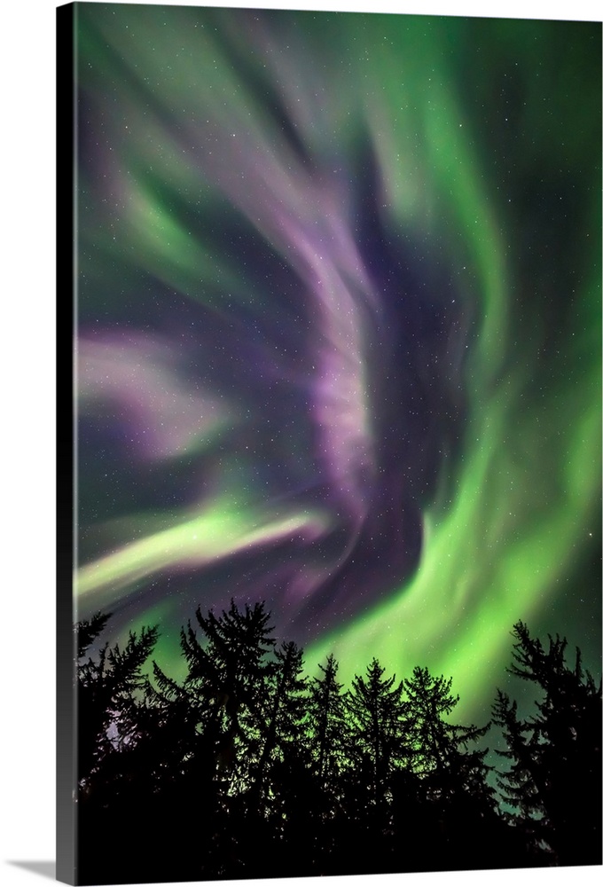 <p>Green and purple northern lights overhead, Tongass National Forest, Southeast Alaska; Alaska, United States of America.</p>