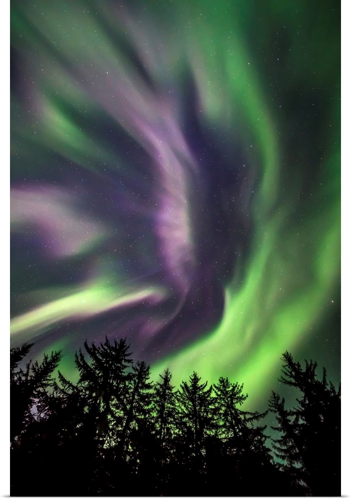 <p>Green and purple northern lights overhead, Tongass National Forest, Southeast Alaska; Alaska, United States of America.</p>