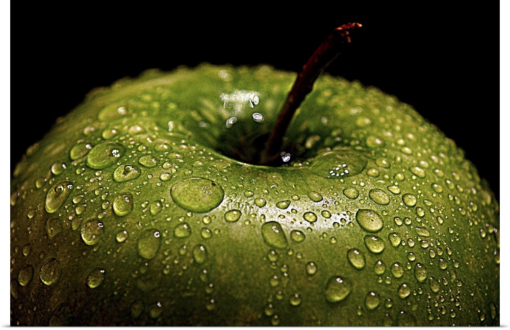 <p>A bright green apple covered in water droplets.</p>