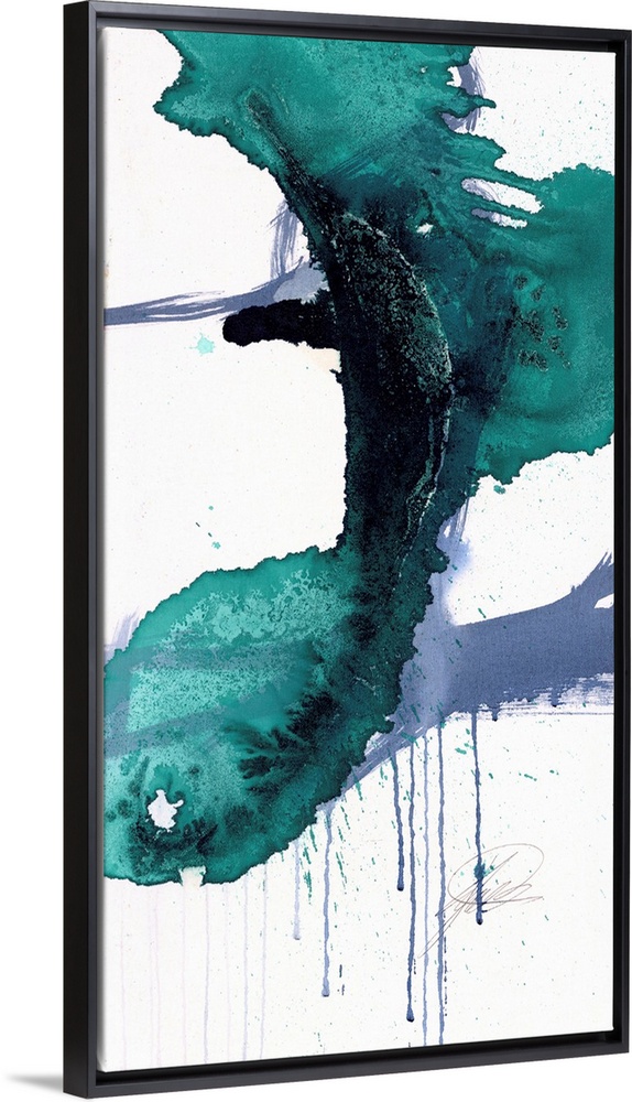 <p>Contemporary abstract artwork in forest green and periwinkle blue over white, with splatters and drips.</p>